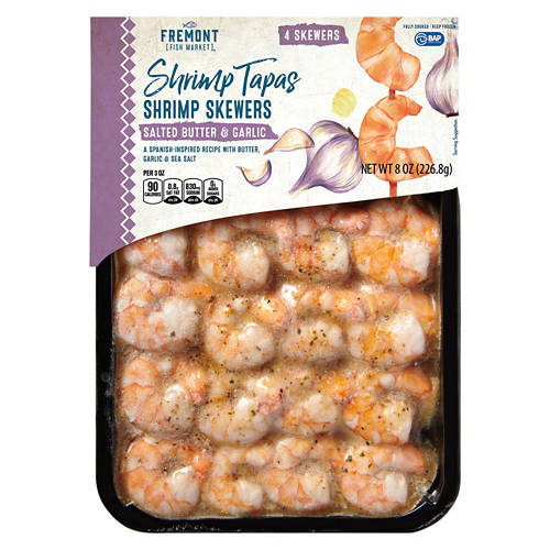 You can't go wrong with these Fremont Fish Market Salted Butter & Garlic Shrimp Skewers! The wild caught shrimp are fully cooked and marinated in a Spanish-inspired blend of melted butter, sea salt, and fresh garlic. Toss yours on the grill for a quick and delicious appetizer to share at your next dinner party!
