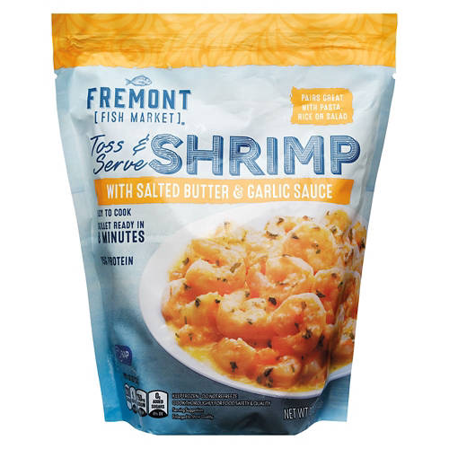 Fremont Fish Market Toss & Serve Shrimp with Salted Butter & Garlic Sauce is your answer to a quick, delectable meal. Ready in just 8 minutes, this shrimp pairs perfectly with pasta, rice or salad. Each serving packs in protein, making it a satisfying option for lunch or dinner. Keep a bag in your freezer for those nights when you want a delicious meal without the wait.