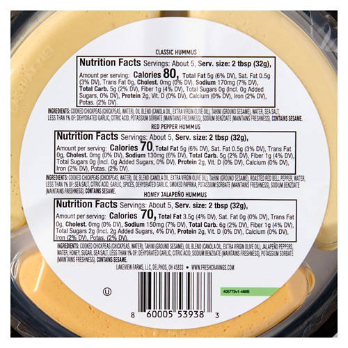 Fresh Cravings Hummus Trio offers a delightful combination of Classic, Honey Jalapeno and Roasted Red Pepper flavors. Made with a custom oil blend including Chilean extra virgin olive oil, it’s perfect for dipping veggies or spreading on sandwiches. This versatile hummus trio caters to various taste preferences in one convenient pack. Keep it refrigerated to maintain freshness and enjoy the rich, flavorful experience of Fresh Cravings Hummus Trio.