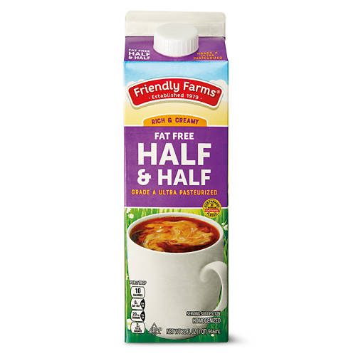 Put the perfect finishing touch on your morning with this Friendly Farms Fat Free Half & Half! The rich, creamy half and half is made with ultra-pasteurized Grade A milk and has no artificial hormones. Add a splash to a cup of steaming coffee as you snack on a flaky pastry to start your day off right!