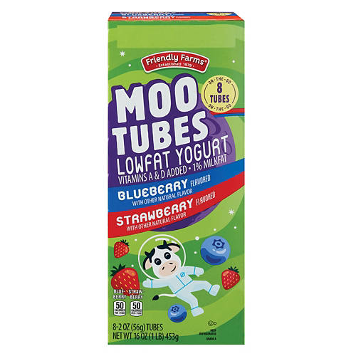 Friendly Farms Moo Tubes Lowfat Yogurt brings fun and flavor to your day with strawberry and blueberry options. Each tube is packed with natural flavors that are perfect for on-the-go snacking. Grab an 8-count pack for a delicious treat that everyone will love.