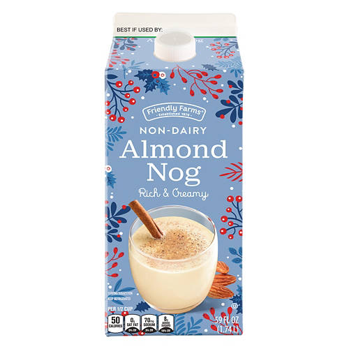 Friendly Farms Non-Dairy Almond Nog is a rich and creamy beverage perfect for festive occasions. Enjoy it chilled or warm, spiced with nutmeg or cinnamon. It's a delightful alternative to traditional eggnog. Indulge in the smooth and nutty flavor of Friendly Farms Non-Dairy Almond Nog and make your celebrations even more special.
