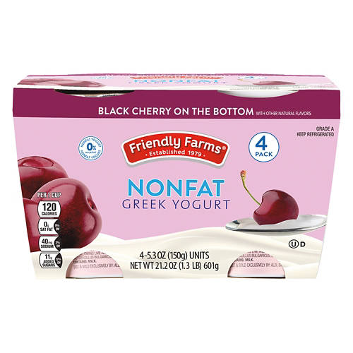 Enjoy the fruity goodness of Friendly Farms Nonfat Black Cherry on the Bottom Greek Yogurt from ALDI . With a sweet layer of juicy black cherries at the bottom, you'll love every bite. Perfect for breakfast, snacks or even as a healthy dessert.
