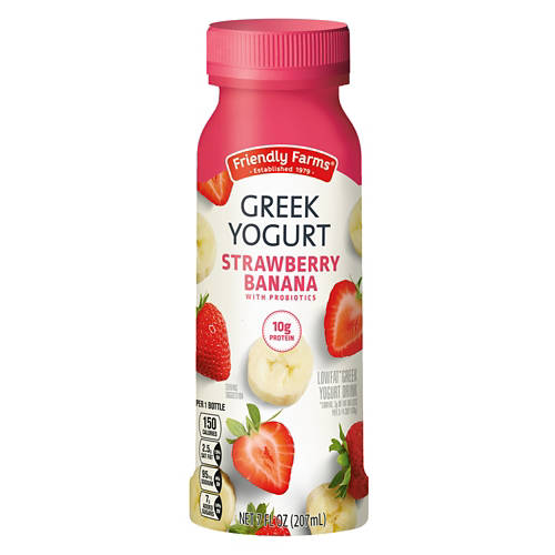 Friendly Farms Strawberry Banana Flavored Drinkable Greek Yogurt is your go-to for a delicious and nutritious boost. Packed with 10g of protein and probiotics, this low-fat yogurt drink is perfect for breakfast or a midday pick-me-up.