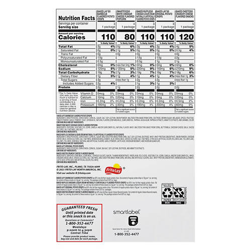Variety Pack includes: Baked Lays Baked Cheetos Baked Lays BBQ Smartfood white cheddar popcorn Baked Ruffles cheddar & sour cream