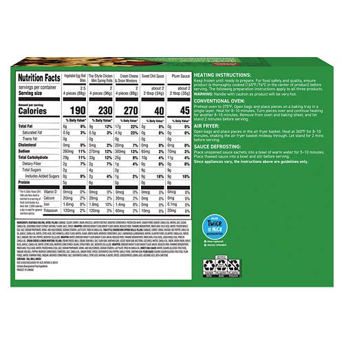 Fusia Asian Inspirations Asian Inspired Appetizer Sampler offers a variety of flavors with 10 vegetable egg roll bites, 8 Thai-style chicken mini spring rolls, and 8 cream cheese and onion wontons. Perfect for gatherings or a quick meal, this sampler provides a delicious assortment of appetizers for any occasion.