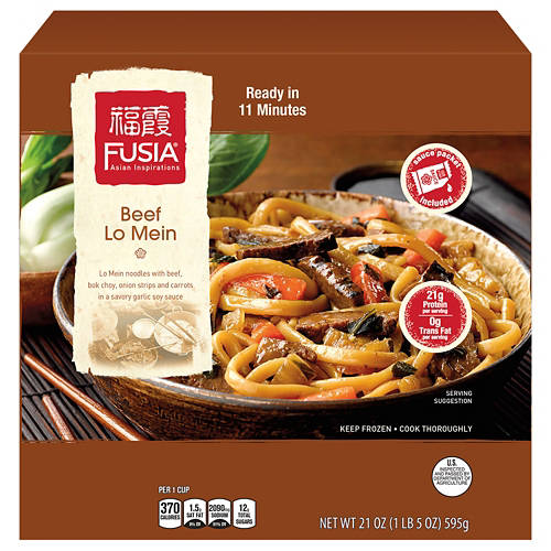 Indulge in Fusia Asian Inspirations Beef Lo Mein, a delightful blend of Lo Mein noodles, tender beef, bok choy, onion strips and carrots in a savory garlic soy sauce. Ready in just 11 minutes, it's perfect for a quick dinner or lunch. Packed with 21g of protein per serving, this meal is both satisfying and delicious. Keep it in your freezer for a convenient, flavorful meal anytime.