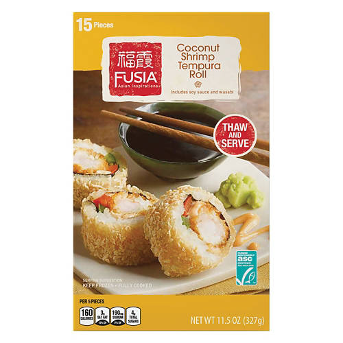 Enjoy the delightful taste of Fusia Asian Inspirations Coconut Tempura Shrimp Roll. This 11.5 oz pack includes 15 pieces, along with soy sauce and wasabi. Ready to thaw and serve, it's a great choice for quick meals or appetizers. Bring a touch of Asian cuisine to your table with this delicious shrimp roll.
