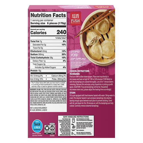 Indulge in the savory goodness of Fusia Asian Inspirations Steamed Pork Dumplings. Perfectly filled with seasoned pork and vegetables, these dumplings are a quick meal solution. Ready in minutes, they are ideal for lunch, dinner or as an appetizer. Microwave and enjoy authentic Asian flavors without leaving home. Add them to your menu for a delicious and satisfying option.