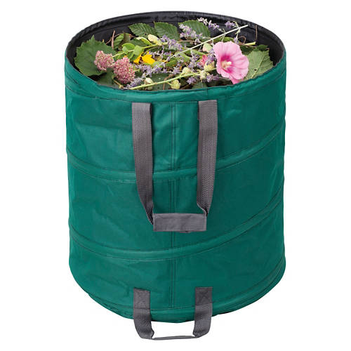 18.5" diameter x 22.83"H Holds aprox. 26 gallons with a 110lb weight capacity For leaves, branch cuttings, grass and other garden waste Collapsible to save space with internal spring that opens bag when ready for use