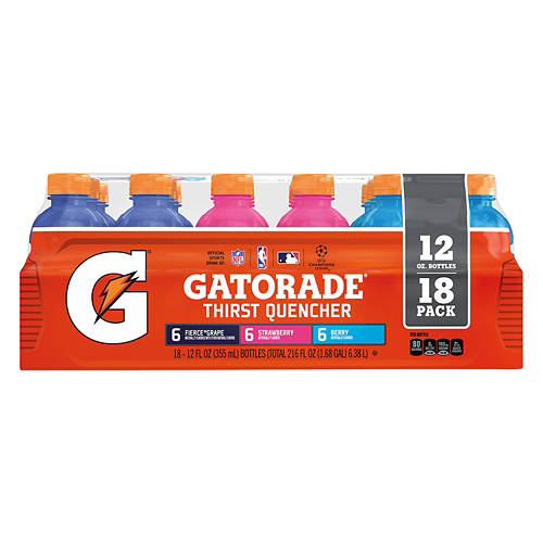 This Gatorade Thirst Quencher Variety Pack offers a refreshing boost with three great flavors in one pack. This 18-pack includes Fierce Grape, Strawberry and Berry flavors, perfect for staying hydrated during workouts or on-the-go. Each 12 fl oz bottle provides the electrolytes needed to keep you fueled and focused. Choose Gatorade for a reliable and delicious way to quench your thirst and replenish essential nutrients. Stay energized and hydrated with Gatorade.