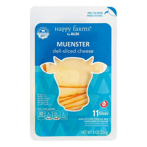 Happy Farms Muenster Cheese is your go-to for a delicious, creamy addition to any meal. Made with real fresh U.S. milk, this deli-sliced cheese is a good source of calcium. Perfect for sandwiches, burgers or melting over your favorite dishes, it brings a rich, smooth flavor to every bite.