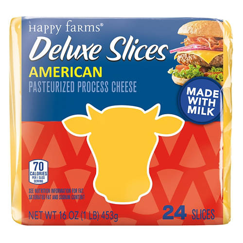 Happy Farms Deluxe American Cheese Slices bring the classic taste you love to your meals. These cheese slices are perfect for burgers, sandwiches or melting over scrambled eggs. Enhance your favorite recipes with the creamy, smooth texture of these slices. Enjoy the classic taste of American cheese with Happy Farms Deluxe American Cheese Slices.