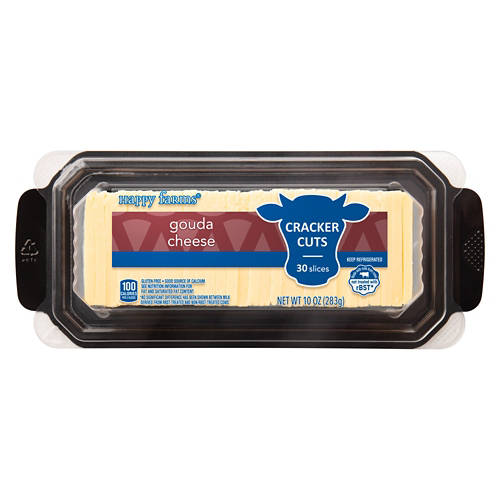 Happy Farms Gouda Cracker Cuts Cheese Slices are the perfect addition to your cheese board or lunchbox. These slices are gluten-free and a good source of calcium, making them a nutritious choice. With 30 slices per pack, you can easily add them to sandwiches or pair with your favorite crackers for a quick and tasty snack. Enjoy the rich, creamy taste of Gouda cheese with every bite. Keep refrigerated.