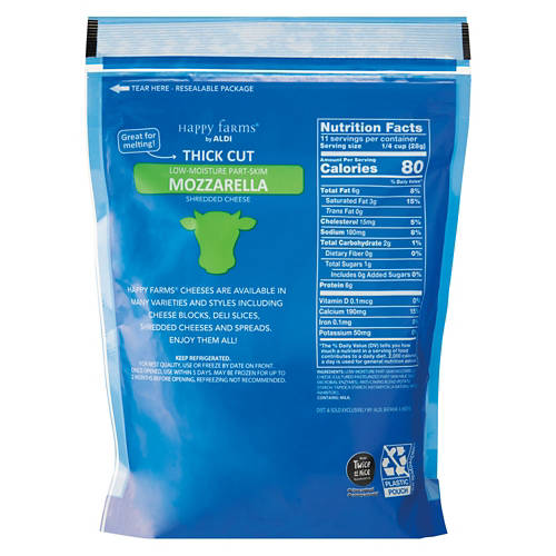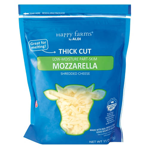 Happy Farms Thick Cut Mozzarella Shredded Cheese is your go-to for delicious meals. Made with real fresh US milk and a good source of calcium, this low-moisture part-skim cheese is great for melting. Perfect for pizzas, casseroles or any dish that needs a cheesy touch. Not treated with rBST, it's a quality choice for your cooking needs. Add Happy Farms Thick Cut Mozzarella Shredded Cheese to your recipes for that extra cheesy goodness.