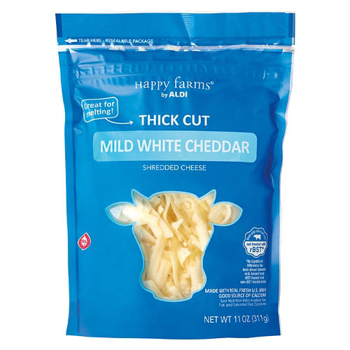 Happy Farms Thick Cut Shredded White Cheddar Cheese from ALDI is rich and flavorful. Perfect for adding to all your favorite dishes including nachos, baked potatoes, casseroles and macaroni and cheese. It’s also great for snacking on its own or adding to salads. Enjoy the versatility of Happy Farms Thick Cut Shredded White Cheddar Cheese and turn ordinary dishes into extraordinary meals with ease!