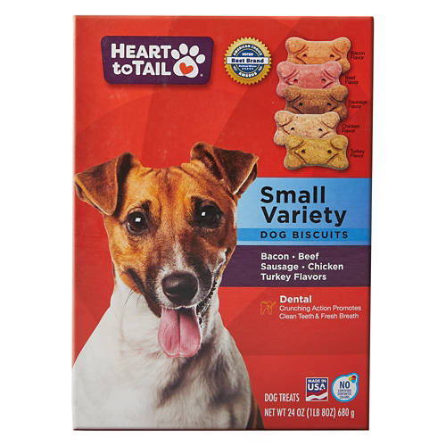 Heart to Tail Variety Dog Biscuits offer an assortment of bacon, beef, sausage, chicken and turkey flavors. These biscuits feature a crunchy texture that promotes clean teeth and fresh breath. Perfect for rewarding good behavior or just because, these dog biscuits will keep tails wagging. With a focus on dental health, Heart to Tail Variety Dog Biscuits are a great choice to keep your pet happy and healthy.