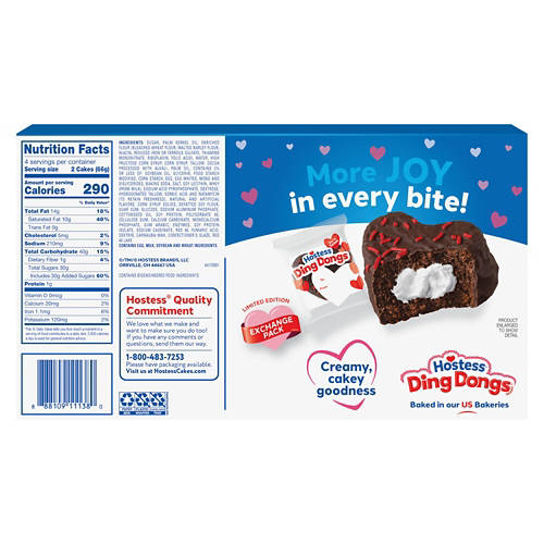 Enjoy a sweet treat on the go with these Hostess Valentine's Day Ding Dongs! Each snack cake is made with moist chocolate cake, a creamy filling, a smooth chocolate coating, & bright heart-shaped sprinkles. They're individually wrapped in signable pouches, perfect for giving as gifts at school or slipping into your kid's lunchbox with a loving message!