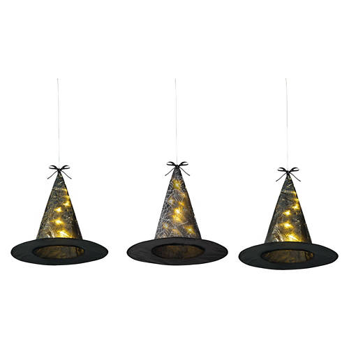 Set of 3 connected witch hats 9.8 ft cord 15" x 15" x 13.4" hats String attached for hanging Battery operated LED lights Requires 3 AA batteries (batteries not included)