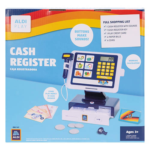 Aldi themed cash register Mindfully designed for imaginative & nurturing pretend-play, your little ones will have so much fun scanning items with the handheld scanner and totaling up groceries with the real working calculator. Set comes complete with play money, swipe-able credit card, locking cash drawer with key & more! 10+ piece set Ideal for ages 3 & up Small Parts Choking Hazard Wipe clean with a damp cloth