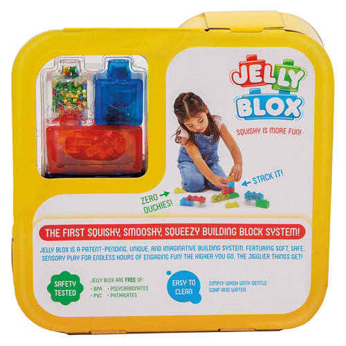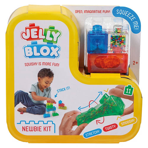 Jelly Blox - the only blocks that bend the rules! Jelly Blox is a patent-pending building system for toddlers & preschoolers that kids can squeeze, stretch, and squish! Designed to support key developmental milestones through the fun of tactile, sensory play, Jelly Blox delivers jiggly construction fun. A few special blocks are also filled with fun sensory fills like sand, foam balls, mini stars, and mini bricks to dial up the fun! Jelly Blox are MESH Accredited - MESH accredited products are evaluated based on their ability to help children develop skills like problem-solving, perseverance, adaptation, conflict resolution, self-regulation, self-advocacy, cognition, and communication. Adults love Jelly Blox too! Oh, and a bonus for parents - not only are Jelly Blox safety tested to ensure worry-free play, but they’re also totally ouch-free; no need to dread those accidental encounters with bare feet! With Jelly Blox, it’s all about bending the rules and stretching the imagination! The Jelly Blox Newbie Kit includes 11 blocks for hours of construction fun! Recommended for ages 2 and up.