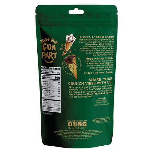 Just the Fun Part Dubai Cones are bite-sized delights filled with milk chocolate and pistachio cream. With crispy kadaifi adding a unique crunch, these treats are perfect for satisfying sweet cravings. Enjoy them straight from the bag or as a topping for ice cream and desserts. Just the Fun Part Dubai Cones offer a delightful blend of flavors and textures for any occasion.