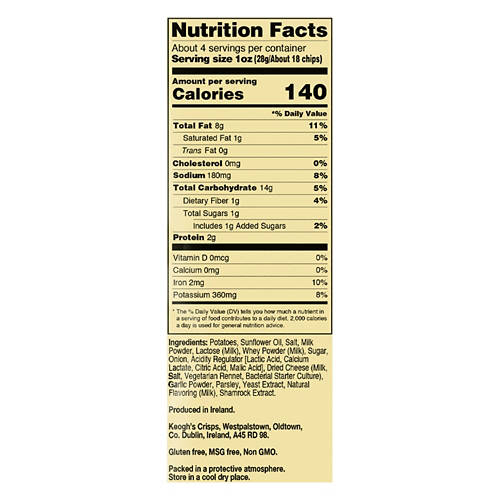 Keogh's Irish Sour Cream & Shamrock Crinkle Cut Potato Chips bring a unique flavor to your snacking experience. These kettle-cooked chips feature a distinct flavor. Perfect for a quick snack or pairing with your favorite sandwich, they offer a delightful crunch and savory flavor. Enjoy a taste of Ireland with Keogh's Crinkle Cut Potato Chips.