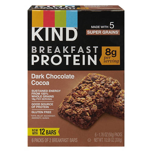 KIND Dark Chocolate Cocoa Breakfast Protein Bars deliver sustained energy from 100% whole grains. These gluten-free bars are packed with 8g of protein per serving and made with five super grains including oats, millet, buckwheat, amaranth and quinoa. Perfect for a quick breakfast or a mid-morning boost, these bars are a good source of protein to keep you fueled throughout the day. Enjoy the rich taste of dark chocolate and cocoa in every bite.