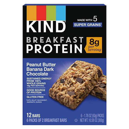 KIND Peanut Butter Banana Dark Chocolate Breakfast Protein Bars offer sustained energy from 100% whole grains. Made with 5 super grains and providing 8g of protein per serving, these gluten-free bars are a good source of protein. Enjoy for breakfast or as a mid-day boost. With a delicious blend of peanut butter, banana and dark chocolate, it's a tasty way to fuel your day.