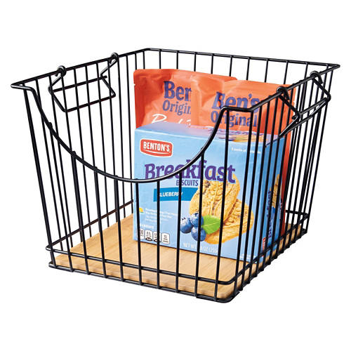 Versatile metal basket with wood inlay Carry handles for easy use Large: 12.2 in L x 10.31 in W x 8.27 in H