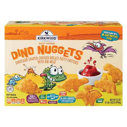 Kirkwood Dino Nuggets are a fun and tasty addition to any meal. These dinosaur-shaped chicken breast patty fritters with rib meat are fully cooked and easy to prepare. Perfect for a quick lunch or dinner, just heat and serve with your favorite dipping sauce. Made with white meat only, they are a hit with kids and adults alike. Add some excitement to your meals with Kirkwood Dino Nuggets!