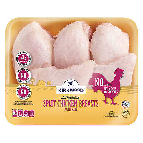 These fresh Kirkwood Chicken Breasts are tender, juicy, and the perfect choice for your favorite chicken recipes. The chicken breasts are split, so they still have bones and skin. For a delicious dinner, just roast the split chicken breasts in the oven with some cooking oil and seasonings!