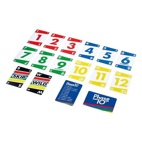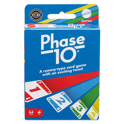 PHASE 10 Card Game - From the makers of UNO? comes a rummy-type card game with a challenging and exciting twist! The object of the game is to be the first player to complete 10 varied phases with two sets of three, one run of seven, or seven cards with the same color. The twist is that each Phase to be completed is specific for each hand dealt. Players who complete one Phase advance to the next, but those who don't must keep trying until they do. Each deck features ?Wild? and Skip? cards, which add excitement and can help you get out of a sticky situation. A ?Wild? card can be used in place of a number card, as well as be used as any color to complete any phase, while a ?Skip? card causes your opponent to lose a turn! Be the first person to complete all ten phases to win the game. Includes 108 cards and instructions. Colors and decorations may vary. Age Grade: 7Y+