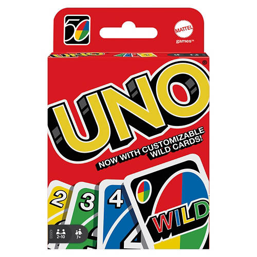UNO® Card Game - UNO™ is the classic and beloved card game that’s easy to pick up and impossible to put down! Players take turns matching a card in their hand with the current card shown on top of the deck either by color or number. Special action cards deliver game-changing moments as they each perform a function to help you defeat your opponents. These include Skips, Reverses, Draw Twos, color-changing Wild and Draw Four Wild cards. You’ll find 25 of each color (red, green, blue, and yellow), plus the eight Wild cards, inside the 108-card deck. If you can’t make a match, you must draw from the central pile! And when you’re down to one card, don’t forget to shout “UNO!” The first player to rid themselves of all the cards in their hand before their opponents wins. It’s Fast Fun for Everyone!™ Includes 108 cards and instructions. Colors and decorations may vary. Age Grade: 7y+