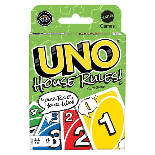 UNO? House Rules - Fans of UNO® card games will love making up their own house rules as they play the innovative House Rules edition. When a player lays down a number card with an "add-a-rule" icon on it, they get to make up a rule on the spot! Then, for the rest of the round, every time a card with that number is played the rule must be enacted. The last player to fulfill the rule last must draw a card. And there can be as many as five house rules at once in every round. With the ability to personalize, UNO® House Rules makes a great gift for fans and game lovers ages 7 years old and up. Colors and decorations may vary. Age Grade: 7Y+