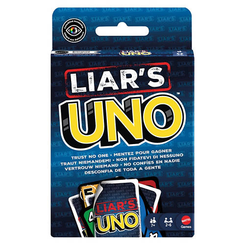 UNO Liars? - Liar's UNO is a fun, deceptive twist on classic UNO where special "liar cards" (marked with a white circle) are played face down, and the player announces a plausible card it could be, bluffing about its true color/number, leading to challenges where the accuser or the liar draws penalty cards if wrong, adding bluffing and trust issues to the familiar game. If a bluff isn't called, the announced card (even an action like a Draw Two or Skip) takes effect. Age Grade: 7Y+