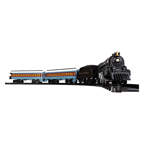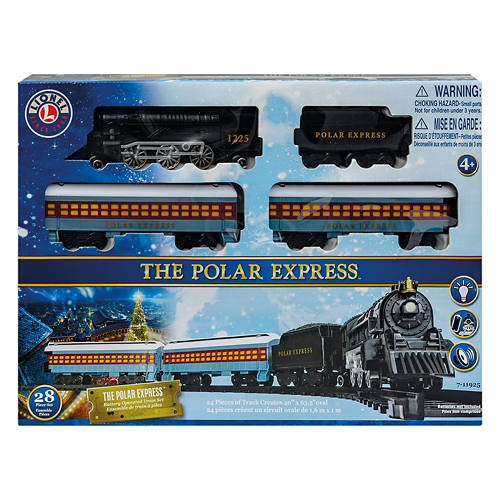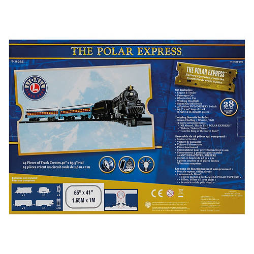 Polar Express 29 Piece Set Engine includes a 3 Position Switch: STOP, FWD w/ sound, FWD w/out sound Engine includes working headlight Passenger Car Observation car 65" x 41" loop of track Looping sounds include: Steam chuffing, whistle and bell Requires 2 AA Batteries (not included)