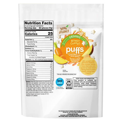 Little Journey Organic Mango & Carrot Puffs are a delightful choice for your little one. Made with whole grains and sweetened with fruit juice concentrate, these puffs are free from certified synthetic colors. Perfect for babies 8 months and older, their small size makes them easy for tiny hands to pick up. Enjoy these flavorful puffs as a wholesome addition to your baby's diet.