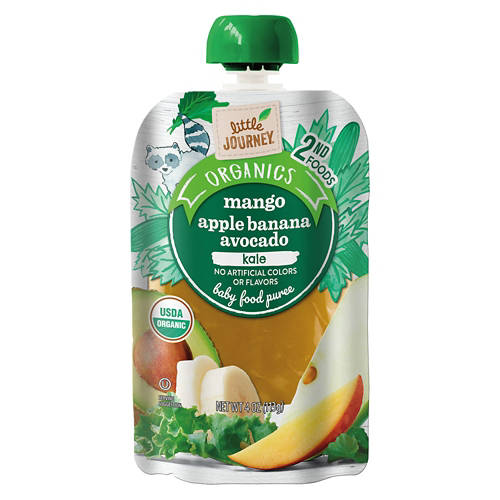 Little Journey Organics Mango Apple Banana Avocado Kale baby food puree is a nutritious blend with no artificial colors or flavors. Perfect for feeding time, this organic pouch combines the sweetness of mango and apple with the richness of banana and avocado, plus a hint of kale. Great for on-the-go meals or at home, it's a simple choice for a healthy and tasty option for your little one.