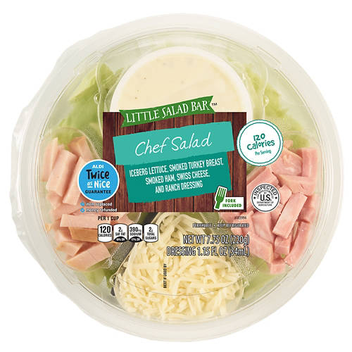 This Little Salad Bar Chef Salad Bowl is the perfect lunch choice for your busiest days. The fresh salad has an iceberg lettuce base and comes with turkey breast, smoked ham, Swiss cheese, and ranch dressing that you can mix in for the perfect meal. It even comes with a fork for the ultimate convenience and ease!