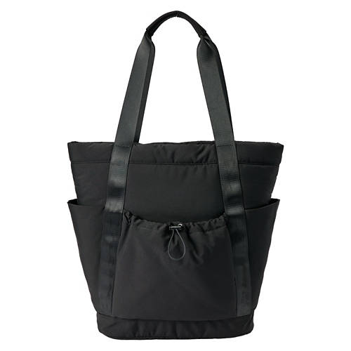 Double handles with shoulder grip Side slip pocket Drawstring front pocket for additional stability