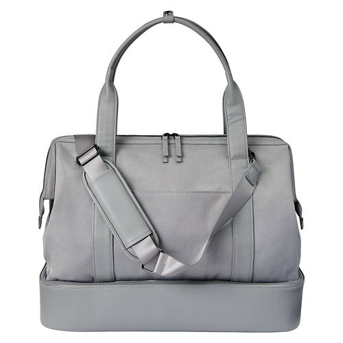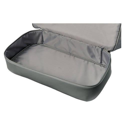 Zipper bottom compartment Metal studs on bottom for stability Double strap with handle loop