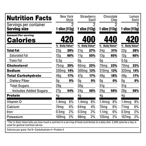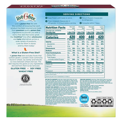 The LiveGfree Gluten Free Cheesecake sampler includes two slices each of New York, strawberry swirl, chocolate chip and lemon swirl cheesecake.