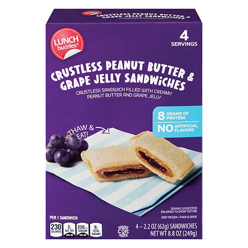 Lunch Buddies Crustless Peanut Butter & Grape Jelly Sandwiches are filled with creamy peanut butter and grape jelly. With 8 grams of protein per serving and no artificial flavors, these sandwiches are a great addition to your lunchbox. Easy to thaw and eat, they're perfect for a quick lunch or snack. Enjoy the timeless peanut butter and jelly combination in every bite.
