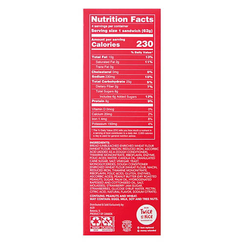 Lunch Buddies Crustless Peanut Butter & Strawberry Jam Sandwiches are a hassle-free choice for a quick meal or snack. Each box contains four sandwiches made with no artificial colors, flavors or high fructose corn syrup. Packed with 8g of protein per serving, these sandwiches are ideal for lunchboxes or a quick snack on-the-go. Just thaw and eat. Simple and delicious.