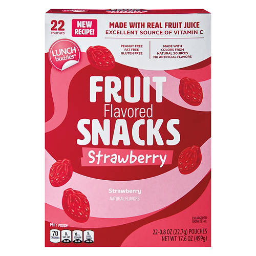 Lunch Buddies Strawberry Flavored Fruit Snacks are made with real fruit juice and are an excellent source of Vitamin C. These peanut-free, fat-free and gluten-free snacks are perfect for school lunches or on-the-go moments. Add these to your cart for a tasty snack option the whole family will enjoy.