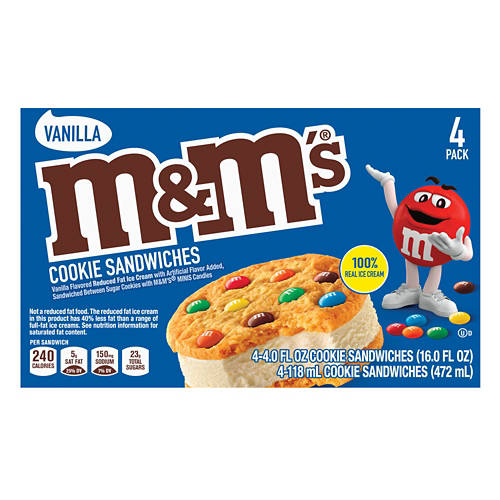These M&M Ice Cream Cookie Sandwiches take a classic summer snack and make it even better! The delicious frozen dessert features two soft cookies loaded with chocolate M&Ms and filled with sweet vanilla ice cream. Enjoy yours on your own or split it in two to savor it with a friend!