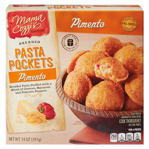 Mama Cozzi Pimento Breaded Pasta Pockets are stuffed with a blend of cheeses, macaroni and pimento peppers. Ideal for quick meals, these pockets are great for air frying or baking. Serve as a tasty appetizer or a fun side dish. Each 14 oz box ensures you have a delicious, easy-to-prepare option on hand. Add Mama Cozzi Pimento Breaded Pasta Pockets to your cart for a flavorful and satisfying dish.