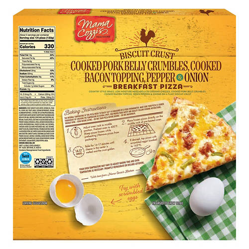 Mama Cozzi's Pizza Kitchen Biscuit Crust Pork Belly, Bacon, Peppers & Onion Pizza is a hearty breakfast option. Featuring a flaky biscuit crust topped with cooked pork belly crumbles, bacon, green peppers and onions, it's perfect for a satisfying morning meal. Simply bake and enjoy this flavorful pizza to kickstart your day. Ideal for busy mornings or a weekend brunch with family.