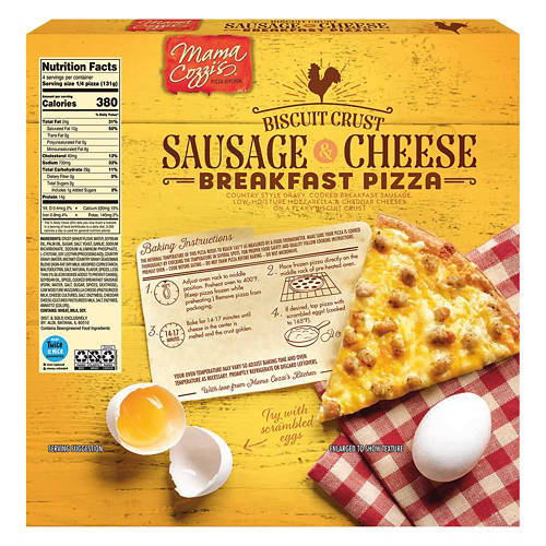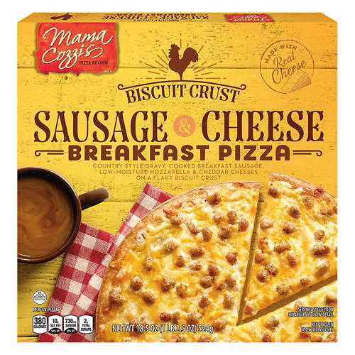 Mama Cozzi's Pizza Kitchen Biscuit Crust Sausage & Cheese Breakfast Pizza is a hearty start to your morning. Topped with country-style gravy, cooked breakfast sausage and a blend of mozzarella and cheddar cheeses on a flaky biscuit crust, it's a delightful twist on breakfast. Perfect for busy mornings, just heat and serve. Add a delicious and satisfying option to your breakfast lineup with this breakfast pizza.